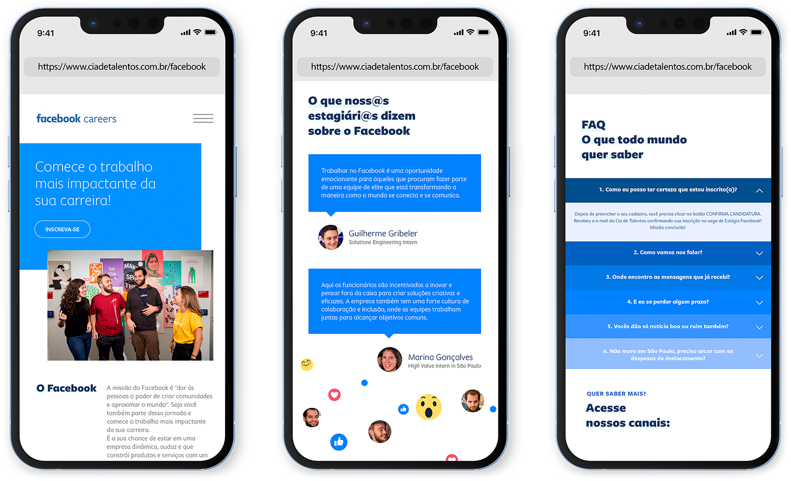 Em 2018, fui chamado para criar o layout do site do Facebook Careers pela Cia de Talentos, sempre seguindo o brandbook da marca, porém sem ficar engessado e com liberdade para criar.